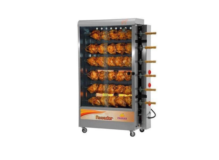 Assador de frangos ideal para restaurantes, bares, padarias, entre outros.O Assador de Frangos Progás PR-631 GLP para 30 unidades, bivolt, tem dimensões de166 cm de altura, 113 cm de largura e 47 cm de profundidade. O modelo é equipado com queimadores infravermelhos e funciona com gás GLP em baixa pressão. Possui acabamento interno em aço inox e estrutura em aço inox escovado, com viseiras frontais em vidro temperado.