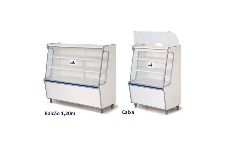 Balcão vitrine 1,20 M expositor seco E vitrine caixa seco com atendimento 70 cm com faixa azul