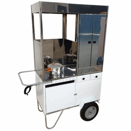Carrinho com estrutura em tubo metalon galvanizado, revestido com chapa inox 430, pequenas partes em chapa galvanizada.