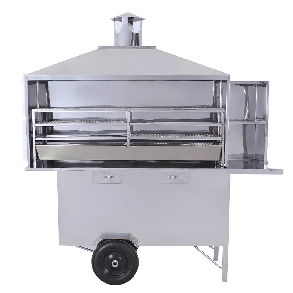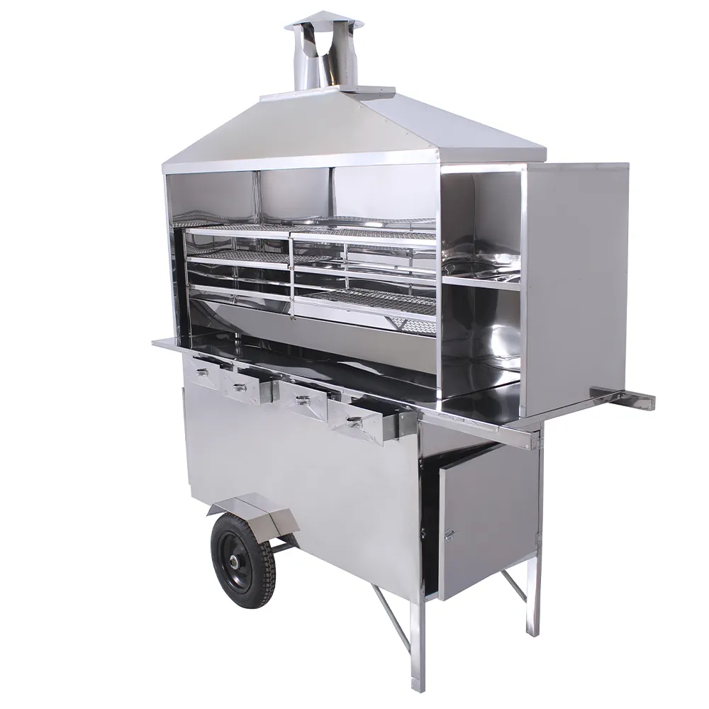 O Carrinho de Churrasco conta com churrasqueira a carvão inteira em aço inox sendo a Churrasqueira do modelo grande com 1,50m possuindo duas grelhas com apoio. Para uma maior maciez durante o transporte, suas duas rodas são com câmara além de Baú com duas portas para guardar os mantimentos de trabalho e duas gavetas para guardar dinheiro que também servem para outras utilidades. A Churrasqueira desse carrinho é a carvão e possui duas grelhas com apoio para uma terceira.