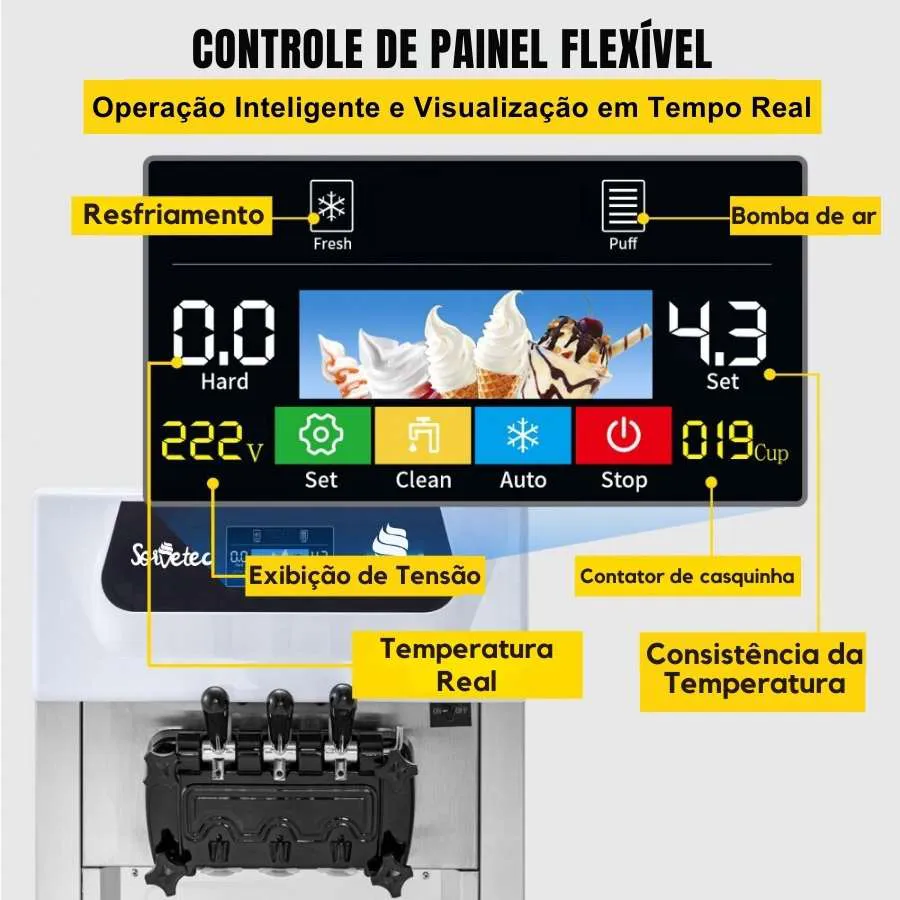 - Tecnologia Inteligente: O painel LCD intuitivo da Máquina de Sorvete BQL 8216-Y facilita o controle de temperatura, tempo e limpeza automática.